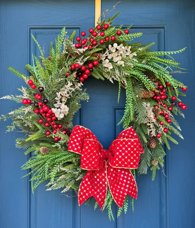 Welcome the season with timeless elegance! This handcrafted holiday wreath features lush evergreen branches, vibrant red berries, golden accents, and pinecones, all beautifully arranged for a festive look. The centerpiece—a stunning red bow with gold detailing—adds a cheerful touch that brightens any entryway or indoor space. Perfect for doors, mantels, or walls, this wreath captures the warmth and joy of the holidays.