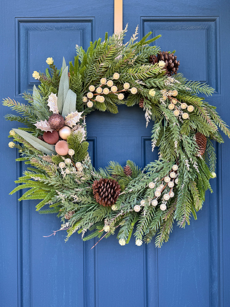 Bring timeless holiday charm to your home with our Rustic Winter Pine & Gold Accent Wreath. Handcrafted with lush evergreen branches, natural pinecones, and golden berry accents, this wreath perfectly blends rustic warmth with elegant shimmer. Ideal for your front door, mantel, or entryway, it adds a cozy seasonal touch that lasts all winter long.